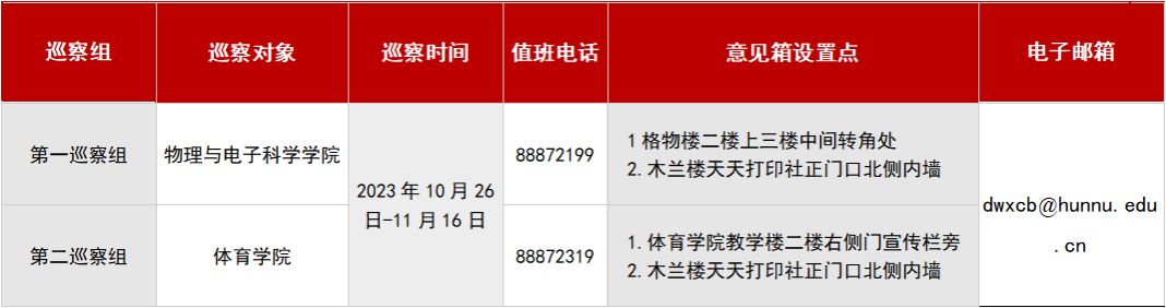 根據《中共湖南師范大學委員會巡察工作實施辦法(試行)》有關規定,經學校黨委研究,學校黨委第三輪校內巡察決定對物理與電子科學學院、體育學院開展常規巡察,目前已經全部完成進駐工作。現將有關事項公告如下: