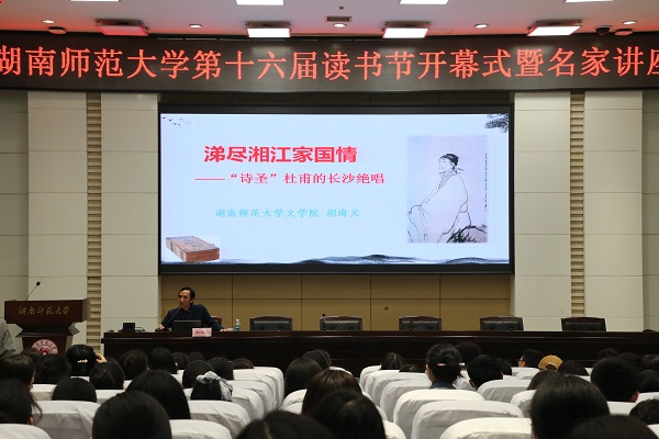 開幕式結(jié)束后,我校文學(xué)院教授、博士生導(dǎo)師胡海義為大家?guī)怼?a>涕盡湘江家國情——‘詩圣’杜甫的長沙絕唱”主題講座。講座由國際漢語文化學(xué)院張紅教授主持。胡海義從知人論世、漂泊入湘、初寓長沙、二寓長沙、三寓長沙、絕筆湖湘六個方面道盡“詩圣”杜甫與長沙的淵源,闡述了杜甫傾注在長沙與湘江最后的熱淚與牽掛,從詩詞的角度揭示了長沙這片土地的傳統(tǒng)文化記憶。