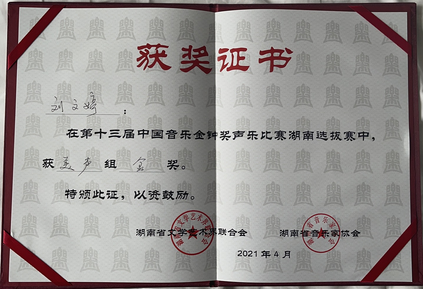 據悉,中國音樂金鐘獎是由中宣部批準設立、由中國文聯和中國音協共同主辦的中國音樂界綜合性專業大獎,是與戲劇梅花獎、電視金鷹獎、電影金雞獎并列的國家級藝術大獎,每兩年舉辦一屆。本屆中國音樂金鐘獎聲樂比賽湖南省選拔賽于4月24日至26日進行,我校師生經過層層選拔和激烈角逐,共同為學校爭得榮譽。
