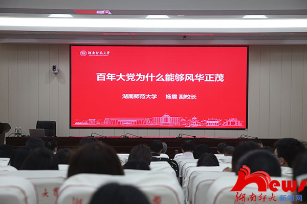 楊震以《百年大黨為什么能夠風華正茂》為題,從我們黨為什么能得到人民的衷心擁護,為什么能走在時代前列,為什么能經得起各種考驗,為什么能永葆朝氣四個方面展開,深刻闡釋了中國共產黨的人民性、時代性、斗爭性和青年性。他帶領大家重溫了中國共產黨團結帶領全國人民實現了中華民族從站起來到富起來,再到強起來的光輝歷程,讓大家對黨的歷史有了系統的了解,對黨的初心使命有了更深刻的感悟。在講授過程中,他著重將百年黨史、湖南巨變和師大變化有機融合了起來,并結合個人國外訪學所見所聞、學校對口扶貧及綜合改革等大量實際案例,深入淺出,娓娓道來,引發了大家強烈的思想共鳴。