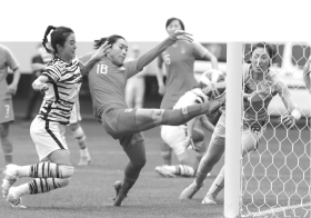 4月13日,中國隊球員唐佳麗(前中)在門前解圍。當日,在江蘇蘇州舉行的東京奧運會女足亞洲區預選賽附加賽第二回合的比賽中,中國隊通過加時賽以2比2戰平韓國隊,從而以總比分4比3勝出,晉級東京奧運會。圖/新華社