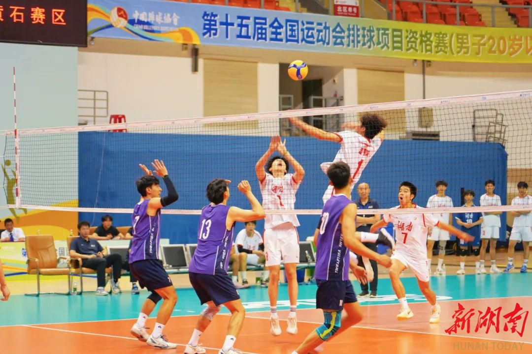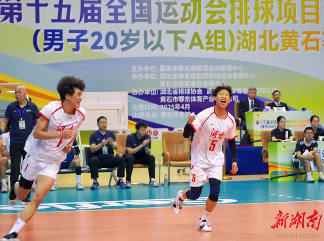 湖南日報·新湖南客戶端4月26日訊(記者 蔡矜宜)4月25日下午,在第十五屆全國運動會排球項目資格賽(男子20歲以下組)湖北黃石賽區的一場焦點大戰中,身著白色球衣的湖南U20男排3比0戰勝天津隊,從而鎖定賽區前五名,湖南青年男排歷史首次闖入全運會決賽階段!