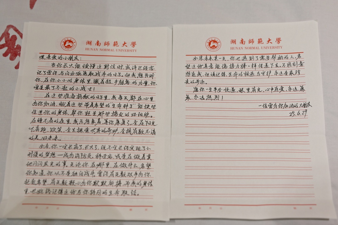 捐獻當日,湖南師范大學學生工作部部長、武裝部部長陳文雄,醫學部黨工委副書記鄢朝暉、醫院管理處處長洪秀琴、學生工作辦公室主任郭銘偉,樹達學院黨委副書記趙鑫海等領導老師專程前往醫院探望慰問歐陽喆。陳文雄、鄢朝暉分別代表學工部、醫學部向歐陽喆表達了崇高的敬意和真摯的感謝。他們表示:“歐陽喆同學的無私捐獻,不僅挽救了一個年幼的生命和一個瀕臨破碎的家庭,更生動展現了醫學生‘敬佑生命、救死扶傷、甘于奉獻、大愛無疆’的職業精神,是師大全體學生的榜樣,是學校的驕傲!”
