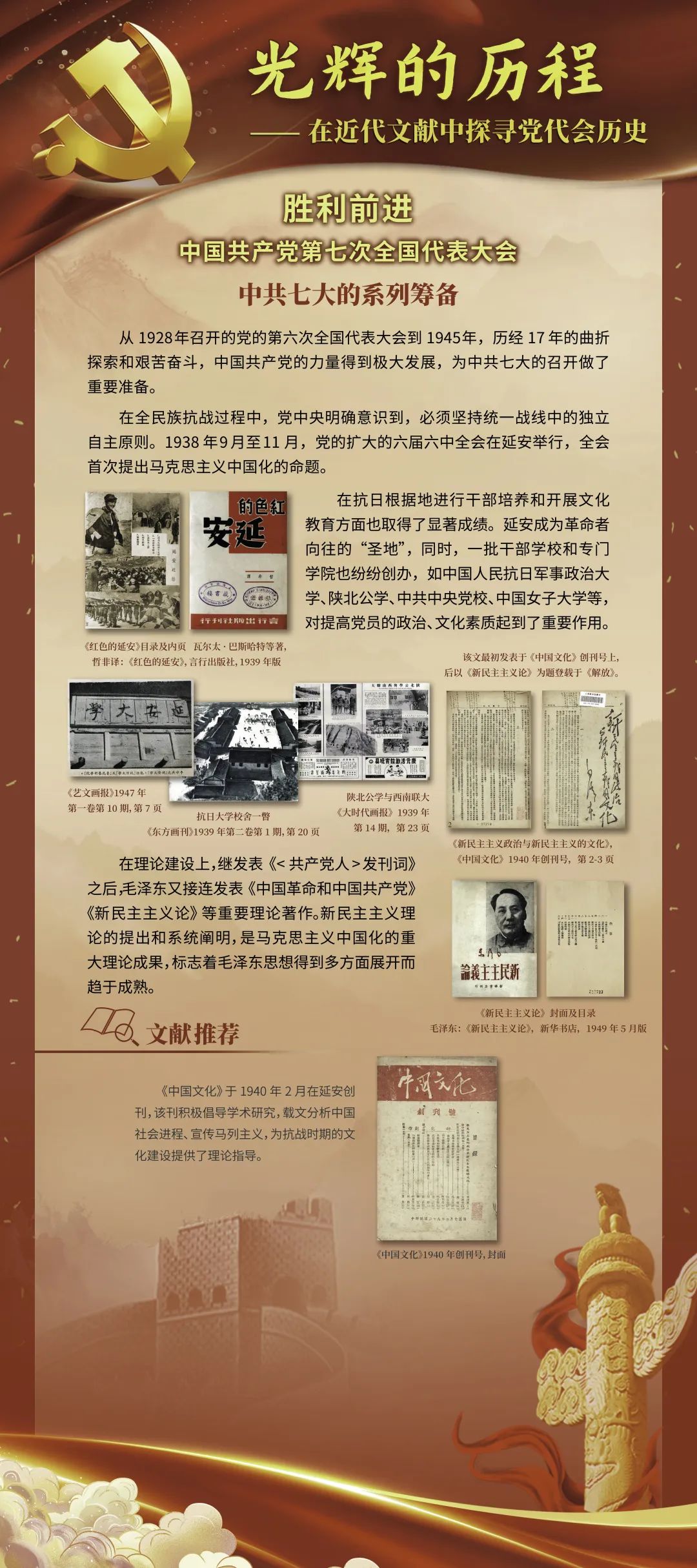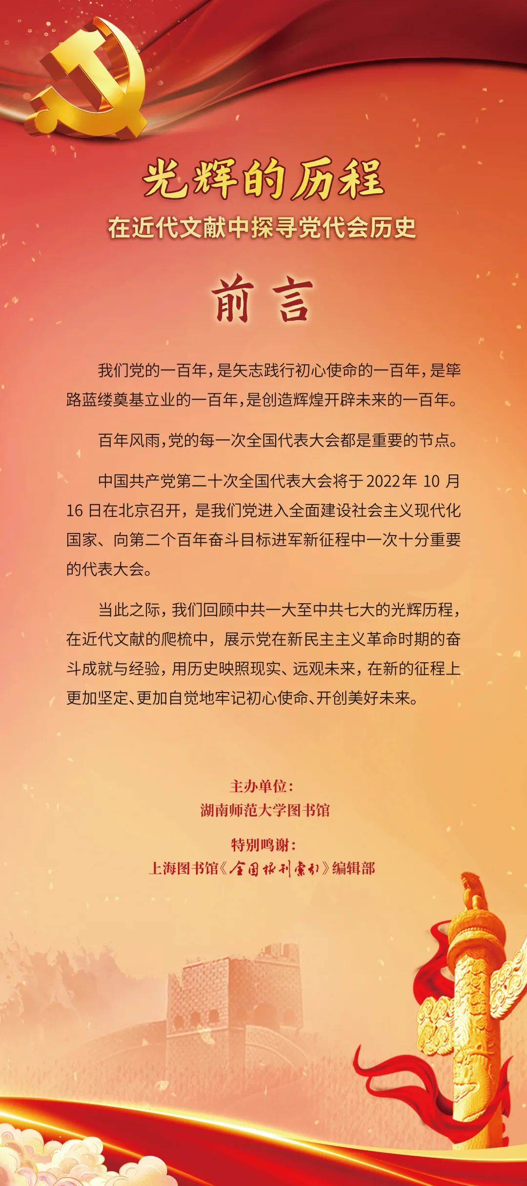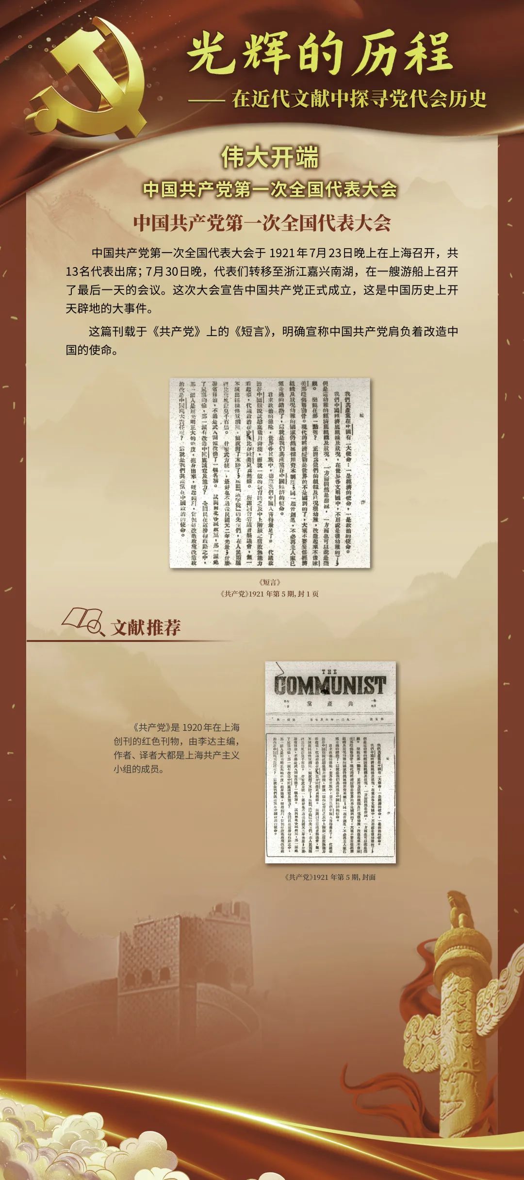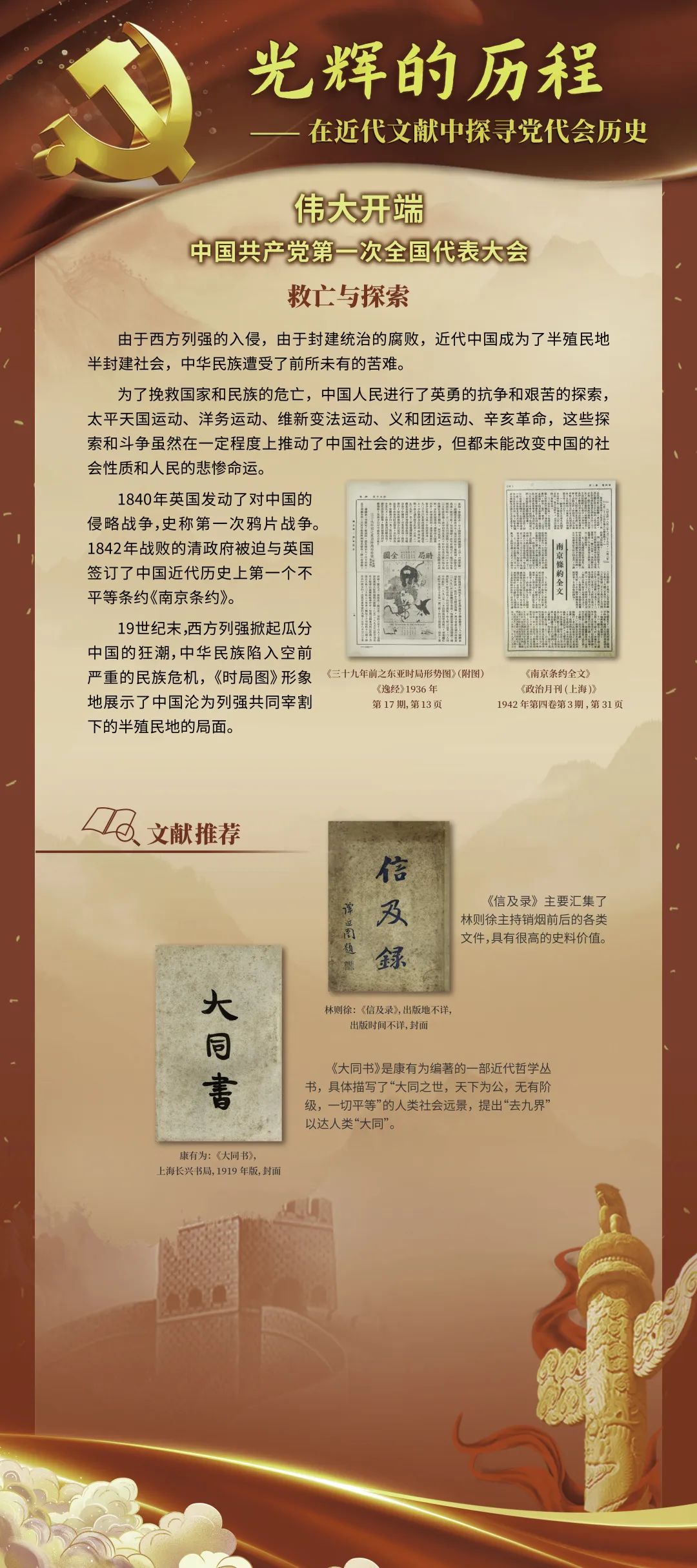 為迎接黨的二十大勝利召開,圖書館聯(lián)合《全國報刊索引》編輯部共同推出“光輝的歷程——在近代文獻中探尋黨代會歷史”展覽,通過展覽回顧中共一大至七大的光輝歷程,在近代文獻中探尋和展示黨在新民主主義革命時期的奮斗成就與經(jīng)驗。用歷史映照現(xiàn)實,遠觀未來,在新的征程上更加堅定、更加自覺地牢記初心使命、開創(chuàng)美好未來。