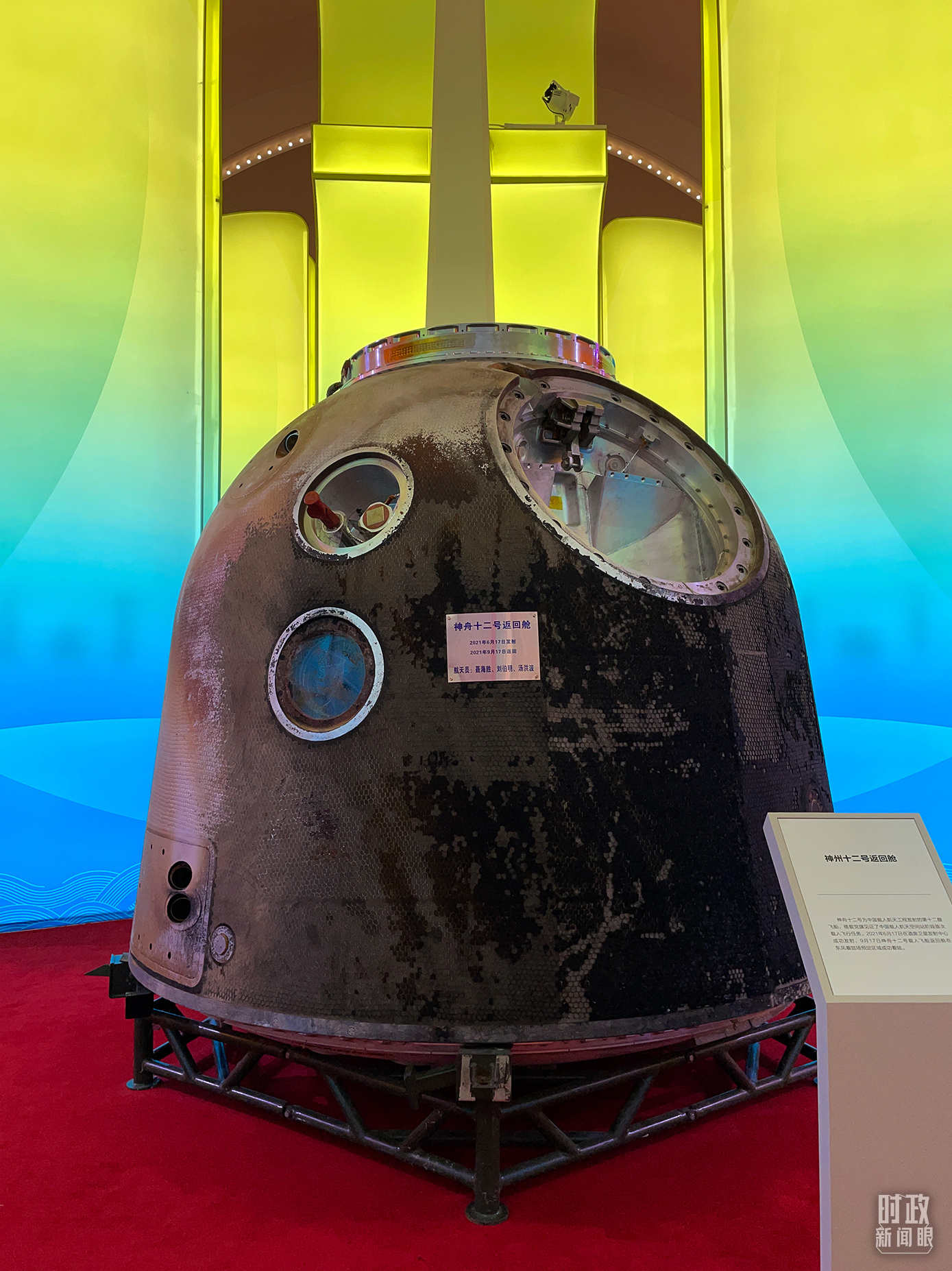 △“奮進新時代”主題成就展上,神舟十二號返回艙展示。(總臺央視記者彭漢明拍攝)